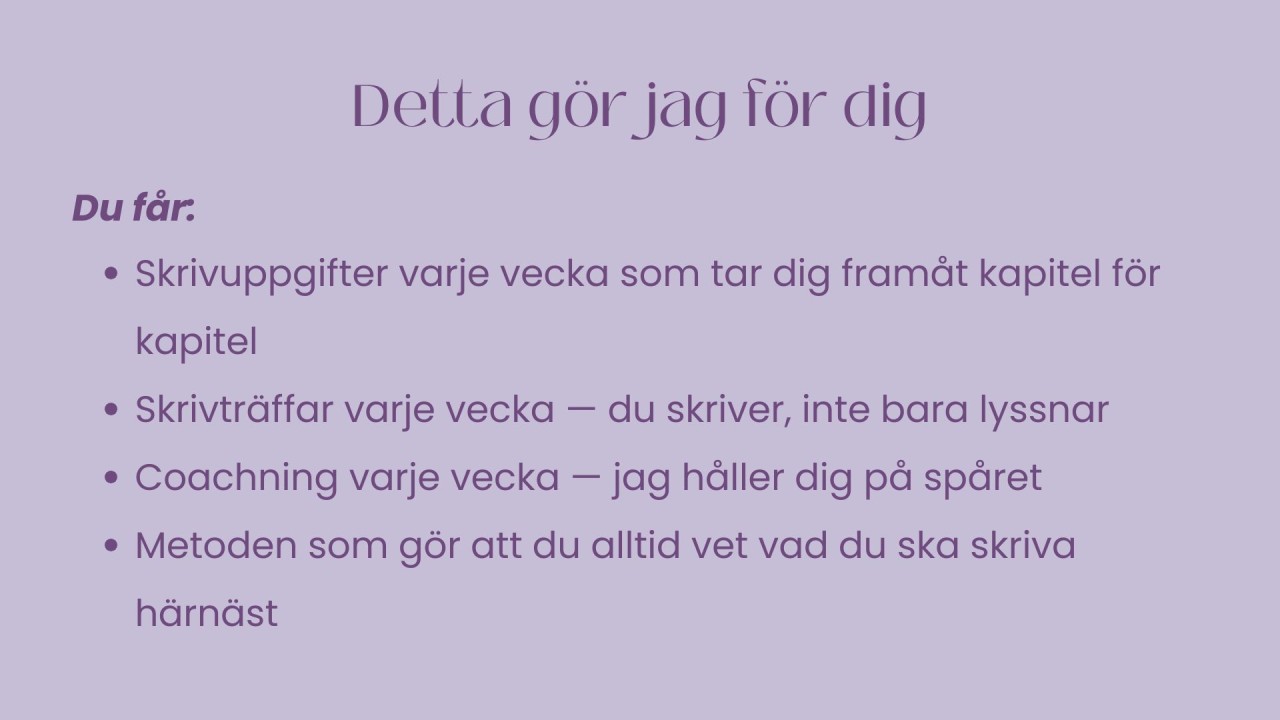 Så när jag säger att jag förstår både glädjen och kampen – då menar jag det på riktigt. Det är därför jag skapade den här kursen. Inte för att berätta hur man skriver. Utan för att faktiskt hjälpa dig att göra det.