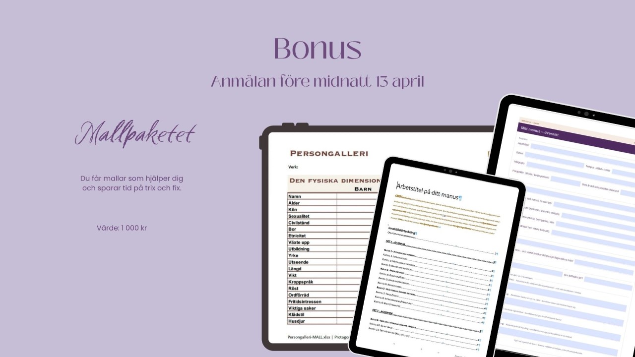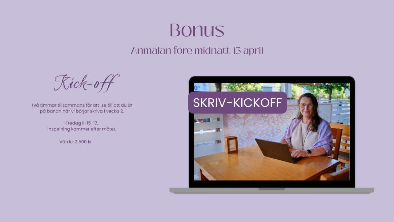 Efter den tiden så har du kvar ditt kursmaterial HELA ÅRET, till 261231 och jag finns också i vårt forum på Bokskrivarakademin för att stötta dig året ut.