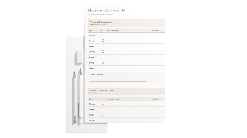 Vad skrev du idag? Hur långt har du kommit? Vad är nästa steg? En enkel men kraftfull checklista som håller dig på spåret under hela kursen.